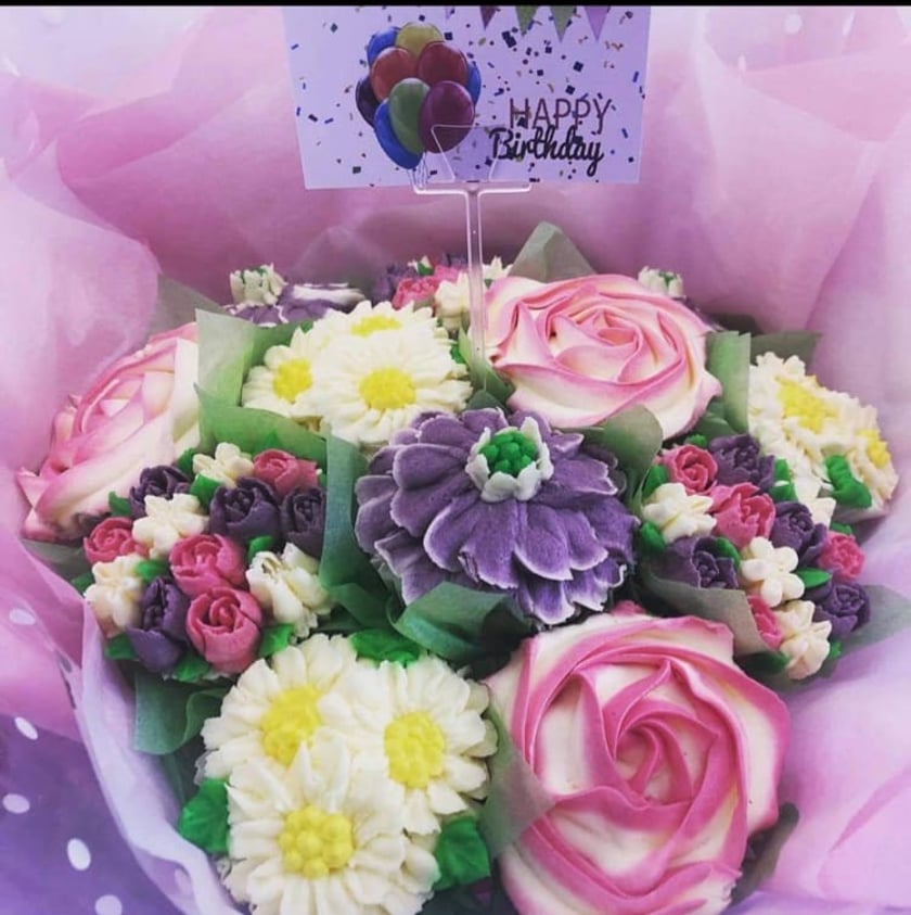Soft pink & white floral cupcakes, beautifully arranged in an elegant bouquet wrap.