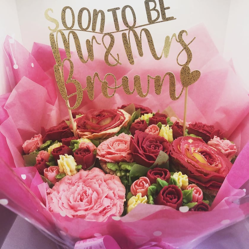 Soft pink & white floral cupcakes, beautifully arranged in an elegant bouquet wrap.